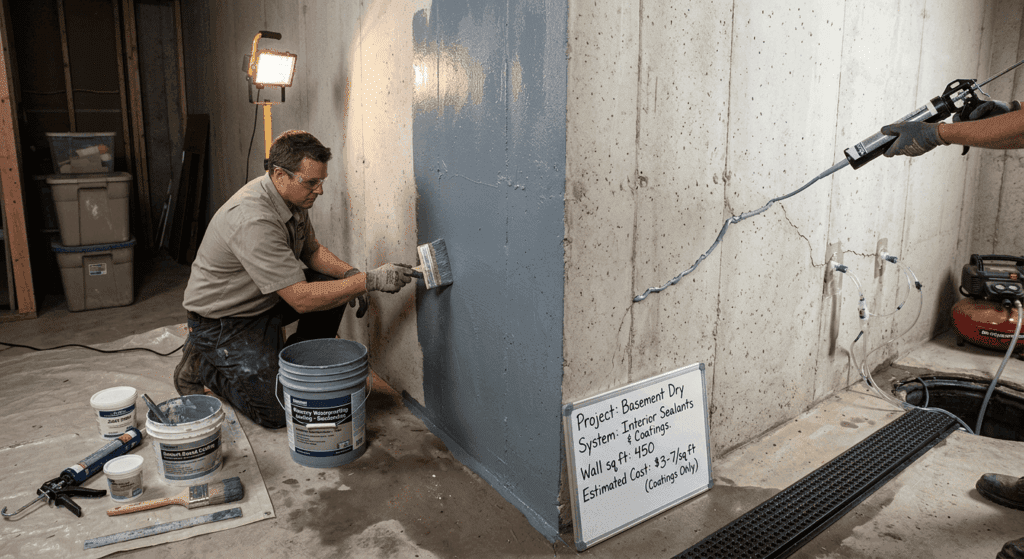 In basement interior waterproofing, coatings may be cement‑based or elastomeric. Elastomeric coatings flex with slight wall movement and adhere well to concrete. The Stewart Milne guide lists waterproof coatings and sealants at around $3–$7 per square foot, making them a relatively affordable option for waterproofing interior basement walls. For serious water infiltration, coatings should be paired with drainage systems.